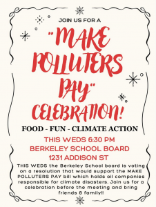 Berkeley High students have introduced a Polluters Pay Climate Superfund resolution to the Berkeley School Board, and it will be voted on Wednesday, April 15th at 7pm!